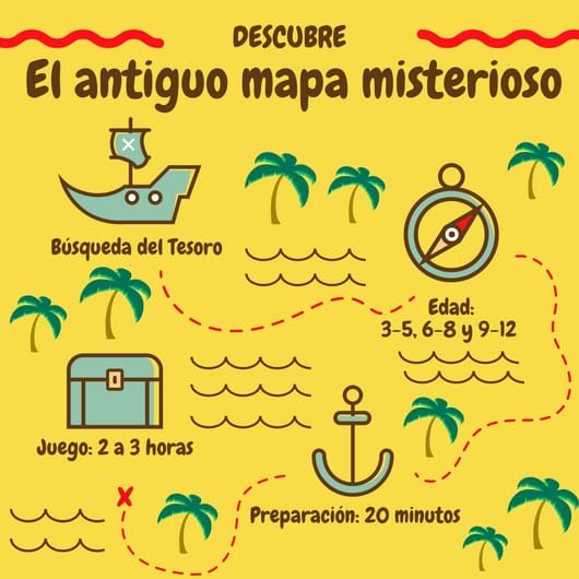 La búsqueda del tesoro "El antiguo mapa misterioso", para que descubras el juego y nuestros kits. Además la recibirás en 3 versiones (3-5 años, 6-8 años y 9-12 años), para que veas la que mejor se adapta a tus hijos.