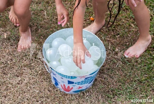 Divide a los niños en equipos. Los niños se sientan en el suelo uno al lado del otro, formando una fila. Al principio de la fila hay un cubo lleno de globos de agua (la misma cantidad para todos los equipos), y al final uno vacío. El objetivo es pasar los globos de un cubo al otro usando solo sus pies. La última persona de la fila coloca los globos de agua en el recipiente vacío. El equipo que termine antes gana.