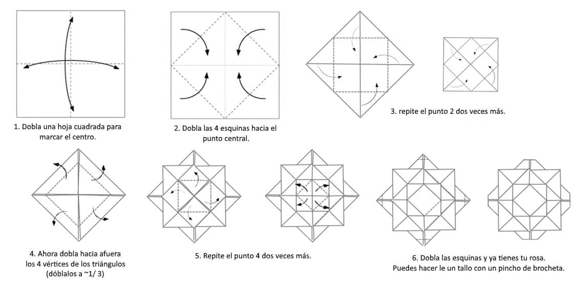 Como este año no sé si podremos comprar rosas, te propongo hacer una de papel. Necesitarás una hoja cuadrada (si es roja mejor). Sigue las instrucciones del dibujo.