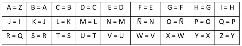 Código ABC – 1: significa que hay un desplazamiento de una letra en las letras del alfabeto, como ves a continuación: