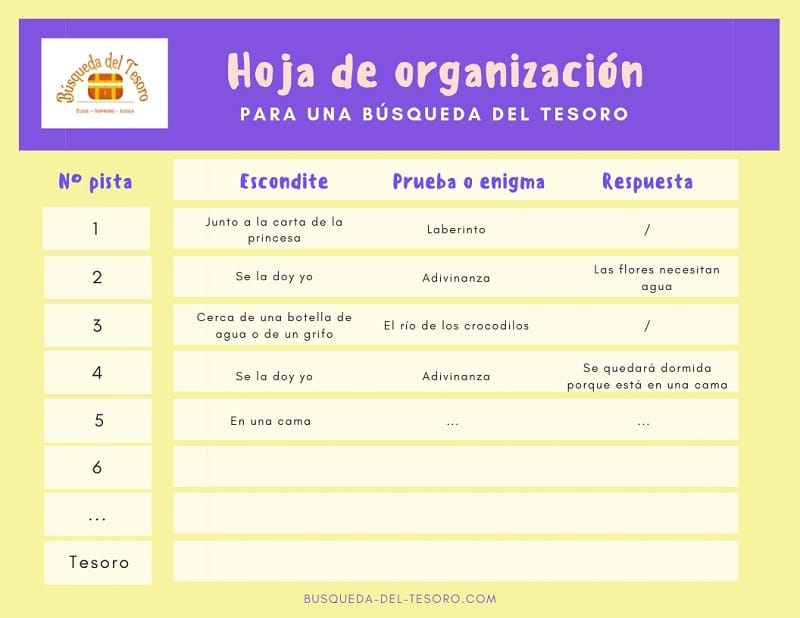 Una vez tienes pensada la historia y sabes cuántas pistas vas a poner, tendrás que hacer la “Hoja de Organización”. Esta hoja te será de gran ayuda para no liarte durante el juego. En ella apuntarás el número de la pista, el lugar dónde la has escondido y la prueba o enigma que los niños tendrán que hacer (con el resultado si lo hay). La hoja de organización la irás rellenando durante los pasos 7, 8, 9 y 10. De momento, simplemente coge una hoja y haz una tabla como la que ves a continuación, con el número de pistas que hayas decidido en el punto 4: