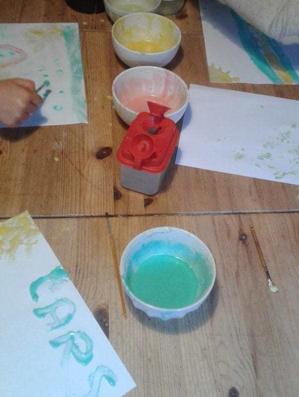Colorante: puedes usar colorante para alimentos (yo es el que uso siempre, para hacer una pintura que no sea tóxica y garantizar la seguridad de la más pequeña que se pone todo en la boca…), pero puedes utilizar cualquier colorante.