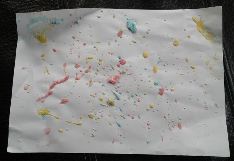 Una vez las obras de arte acabadas, pon la hoja (o cartulina/cartón) en el microondas unos 30 segundos a 750W. Si no tienes microondas, puedes acercarla a una fuente de calor (horno) o ponerla al sol.