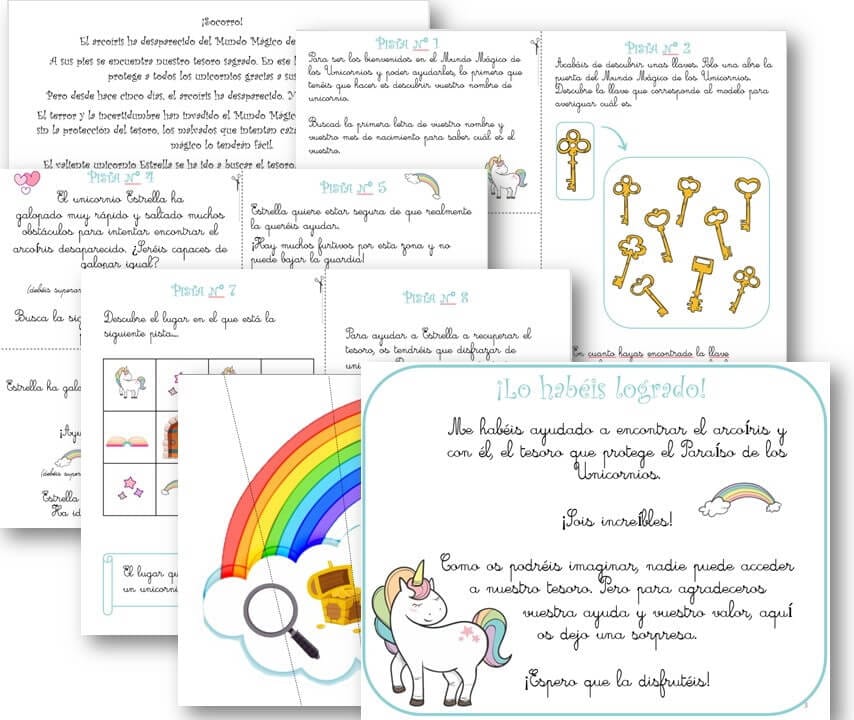 «El unicornio desaparecido” es un juego de unicornios tipo búsqueda del tesoro listo para usar. Está pensado para jugar con niños de 3 a 5 años en el interior. No es un juego competitivo, todos los niños juegan juntos para buscar pistas, resolver acertijos y conseguir encontrar el arcoíris. Es un juego fácil de organizar y jugar, sólo tendrás que seguir las instrucciones que se incluyen en el documento.