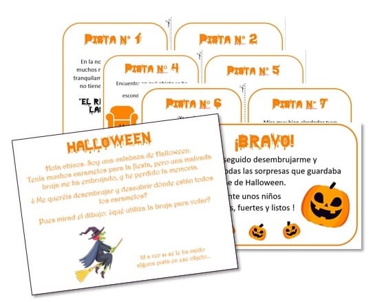 Esta búsqueda del tesoro ha sido diseñada para jugar con niños de 3 a 5 años. No es un juego competitivo, todos los niños juegan juntos para buscar pistas, resolver acertijos y conseguir desembrujar a la calabaza. Es un juego fácil de organizar y jugar, sólo tendrás que seguir las instrucciones que se incluyen en el documento.