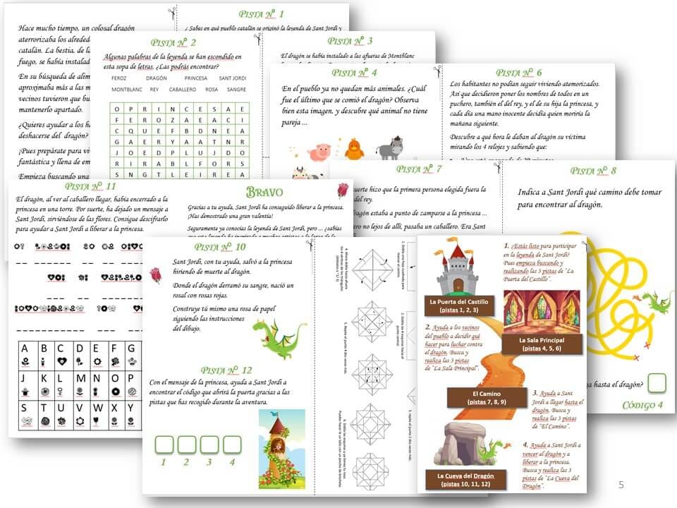 «La leyenda de Sant Jordi» es un escape room que ha sido diseñado para jugar con niños de 6 a 12 años en el interior o en el exterior. No es un juego competitivo, todos los niños juegan juntos para buscar pistas, resolver acertijos y conseguir liberar a la princesa. Es un juego fácil de organizar y jugar, sólo tendrás que seguir las instrucciones que se incluyen en el documento.