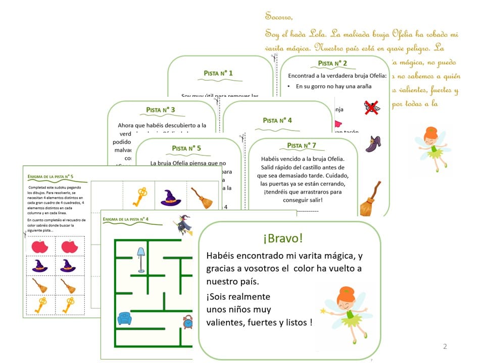 Un solo documento pdf con las instrucciones, las pistas para imprimir, la lista del lugar donde esconder cada pista, las soluciones de los enigmas y una tarjeta de «Bravo» para esconder con el tesoro.