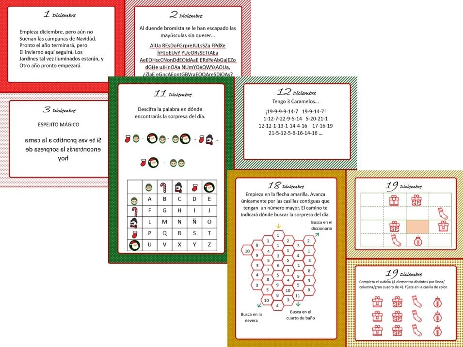 Lo mejor, es que ya está todo hecho. Los enigmas diarios, la tabla de organización con los escondites para cada día, los “vale por”, e incluso el “descodificador de mensajes secretos”. Sólo tienes que imprimir el documento.